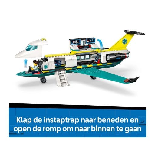 De fantasie stijgt tot grote hoogten met het LEGO® City Ambulancevliegtuig (60465), een speelset voor kinderen van 6 jaar en ouder. Dit tweemotorige vliegtuig zit boordevol coole functies, waaronder een uitklapbare trap en een medisch laboratorium aan boord. De set bevat ook een sneeuwscooter en een klein vliegveldgedeelte met een windzak, plus EHBO-accessoires en minifiguren van een piloot, arts, ambulancemedewerker en skiër voor reddingsmissies boordevol actie.Dit LEGO City vliegtuig bevat digitale instructies in de LEGO Builder app. Hier kunnen kinderen inzoomen en modellen in 3D draaien, hun voortgang bijhouden tijdens het bouwen en andere speelsets verkennen en opslaan.LEGO City sets bieden avonturen boordevol actie voor eindeloos creatief speelplezier. Combineer dit ambulancevliegtuig met andere sets (apart verkrijgbaar) uit de LEGO City reeks voor nog grotere avonturen. De set bevat 403 onderdelen.