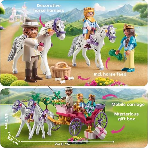 De sierlijke koets wordt voortgetrokken door twee elegante paarden. Daardoor lijkt het net alsof de prins en prinses onderweg zijn naar een koninklijk feest. Bovendien zorgen de accessoires en details voor extra speelmogelijkheden tijdens het spelen. Deze set hoort bij de betoverende Playmobil Princess collectie, waarin kastelen, prinsessen en sprookjes centraal staan.