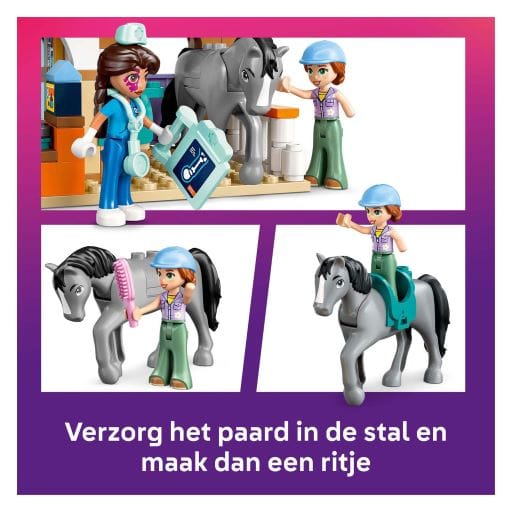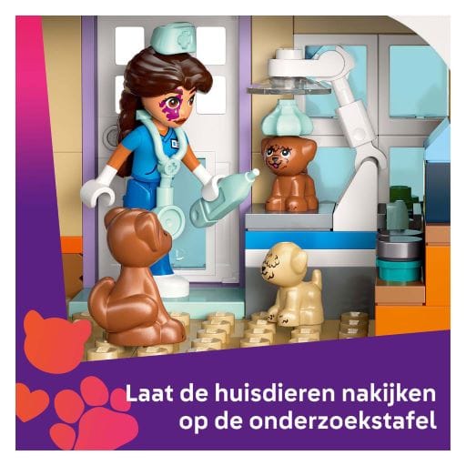 Stimuleer creatieve rollenspellen voor dierenliefhebbers vanaf 7 jaar. Dit LEGO Friends Dierenkliniek voor paarden en huisdieren (42651) bouwpakket voor kinderen bevat 3 LEGO Friends poppetjes en dieren figuren van een speelgoed paard, 3 honden en een kat. Deze set heeft werkruimte voor dierenarts Eniko met een onderzoekstafel, diervoer, veterinaire apparatuur en een weegschaal. In de stal vind je hooi, een hooivork, een borstel, een zadel en een klembord met de röntgenfoto van het paard. Kinderen kunnen verhalen naspelen waarin Olly zijn kat meeneemt naar de dierenarts en Autumn de kliniek bezoekt met haar paard. De dierenarts heeft haar eigen huisdieren – een hond en twee puppy’s. Nadat ze de dieren heeft onderzocht, is het tijd voor Eniko om naar boven te gaan, waar een slaapkamer en badkamer te vinden zijn. Deze set wordt geleverd met veel leuke accessoires met dierenthema en is een geweldig cadeau voor meisjes en jongens die dol zijn op dieren verzorgen, bouwen en de LEGO Friends personages. Ontdek meer creatief speelgoed (apart verkrijgbaar) in het LEGO Friends universum. Afmetingen: het hoofdmodel in deze set is ca. 15 cm hoog, 20 cm breed en 9 cm diep. Bavat 478 onderdelen.Fantasiespel voor dierenliefhebbers – deze Dierenkliniek voor paarden en huisdieren voor meisjes, jongens en dierenvrienden van 7 jaar en ouder bevat 3 LEGO Friends poppetjes, een speelgoed paard, 3 honden en een katPaard en stal – vertel leuke verhalen met Thunder, het paard dat in de stal verblijft en wordt geleverd met accessoires waaronder een cap, zadel, hooivork, borstel, hooi en röntgenfoto’s3 poppetjes en 5 speelgoed dieren figuren – dit sociale speelgoed bevordert de creativiteit wanneer kinderen verhalen verzinnen over hoe Olly en Autumn de dierenkliniek bezoeken met hun huisdierenAccessoires om dieren te verzorgen – deze speelgoedset met dieren bevat veel leuke accessoires voor rollenspellen, waaronder een speelgoed kassa, LEGO zonnebloemen, diervoer, een dierenartshoed, poepelementen, shampoo en zeepEen cadeau voor meisjes en jongens – deze LEGO dieren speelset is een leuk verjaardagscadeau voor kinderen die van dieren houden en graag creatieve verhalen vertellenOnline serie – inspireer meer creatief spel met andere sets (apart verkrijgbaar) en de online serie LEGO Friends: Een Nieuw Hoofdstuk, waar kinderen de personages van Heartlake City kunnen leren kennen.