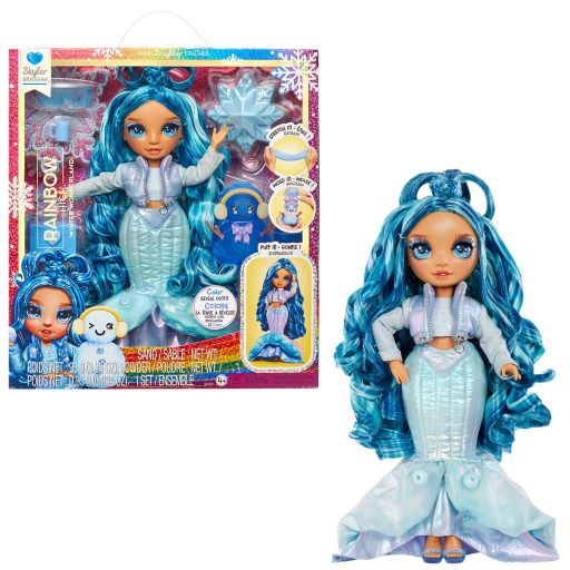 • • SCHITTERENDE WINTERKLEDING: Skyler is van top tot teen gekleed in het BLAUW. Haar mode (jack, T-shirt, zeemeerminnenrok) is voorzien van geweldige details en ze heeft bijpassende blauwe hakken, een tasje en zonnebril bij zich. Ze draagt haar prachtige, blauwe haar deels in een klein knotje boven op haar hoofd en deels los met extra lange pijpenkrullen. Ze heeft lange wimpers en glazen ogen.