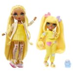 Rainbow Junior High party fashion doll – Sunny MadisonSunny is gekleed in een schattige tweedelige pyjamaset en bijpassende gele pantoffels. Ze heeft een schattig jonger gezicht, mooi lang, steil haar in twee paardenstaarten met strikklemmen, en een korte pony, lange wimpers en glazen ogen.Ze is 23 cm lang en volledig beweegbaar en beweegbaar, haar armen en benen buigen voor zoveel leuke poses.Inhoud: Modepop, een complete pyjama-outfit, een paar poppenpantoffels, 2 microfoons, draagbare luidspreker, discolamp, tablet, 2 stoelclips en poppenkam.