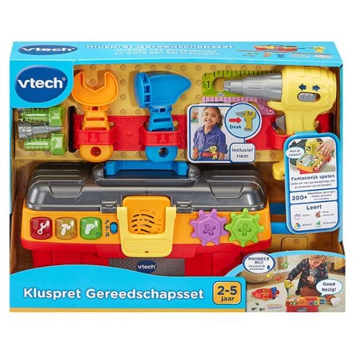 Kleine klussers opgelet, beleef dolle pret met deze gereedschapsset! Plaats het gereedschap in de gereedschapsriem en start met klussen tijdens 3 verschillende speelstanden. Druk op de knipperende toetsen, plaats een kaart in de sleuf, sla een spijker op z’n kop en draai een schroef in de openingen om te spelen. Maak kennis met cijfers en kleuren én leer hoe je het gereedschap kunt gebruiken. Gereedschap klaar? Klussen maar!