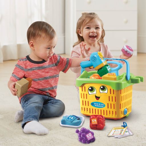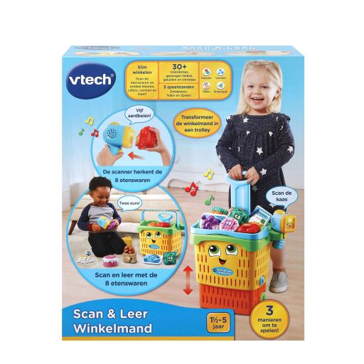 Het is tijd om boodschappen te doen met de VTech Scan & Leer 2 in 1 winkelmand! Gebruik de interactieve scanner en scan de 8 etenswaren om vormen, kleuren, cijfers en nog meer te ontdekken! 2 in 1: verander de winkelmand eenvoudig naar een trolley met wieltjes. De verschillende reacties en de vele accessoires stimuleren het spelen van rollenspellen en prikkelen de fantasie. Berg na het spelen eenvoudig de scanner op in de houder van de winkelmand.